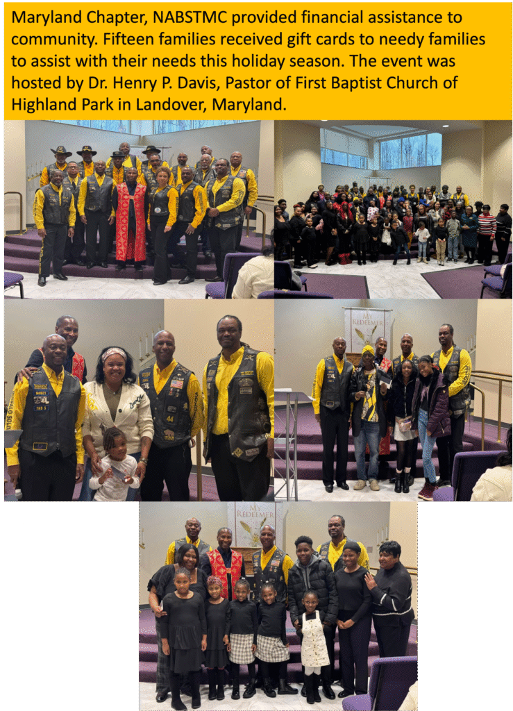 The mission of the National Association Buffalo Soldiers and Troopers Motorcycle Club (NABSTMC) – Maryland Chapter Inc.,(501.C.3) is community service. It is our #1 mission and calling card. We take pride in making a difference in our local community and we continue to grow our community service initiatives and efforts each year. We look to partner with like-minded individuals and organizations to further our efforts in the community. The NABSTMC-Maryland Chapter, Inc conducts four principal community service activities and charity events.